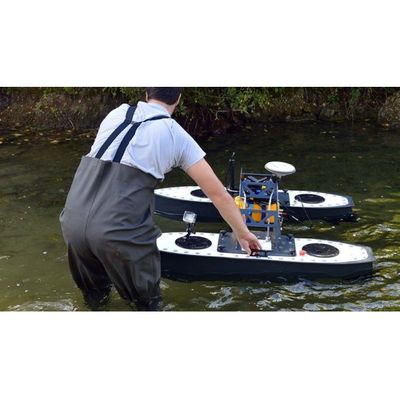 This hydrographic survey vessel is composed of tough aluminium hulls and weed cutting propellers. It runs bathymetric surveys in areas where access for a traditional survey vessel is not possible. Places such as quarry lakes, lagoons, mining ponds and shallow water zones.
