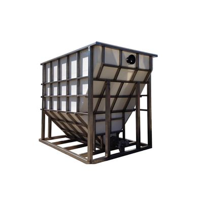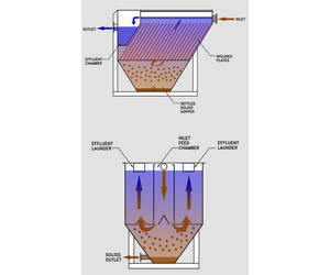 A waste stream with flocculated solids enters the center influent chamber. The liquid/solid solution is then directed through a chamber of inclined plates. The water travels through the space between the plates at a low velocity, which creates an even laminar flow. This causes the solids to slide down the plates into the solids hopper. The liquid portion of the solution continues to rise to the top of the tank and is collected into a clean water chamber.