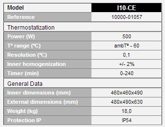Incubator transparent made of metacrilate (Plexiglas), controlled by microprocessor; Digital display LCD backlighted with indication of the selected and real value of the temperature and timer. Membrane push-button control. With forced air circulation. Optional: external Tª sensor for control the temperature of the sample in its proximity. Can be adapted to our orbital shakers and horizontals (models Orbital Midi, Orbital Maxi or Horizontal Maxi).