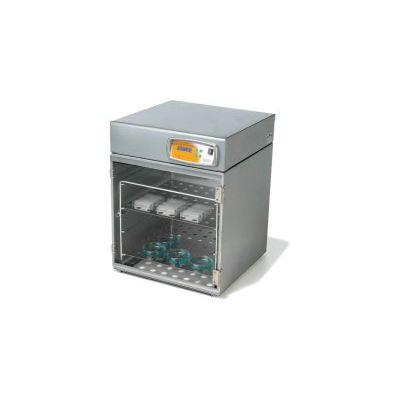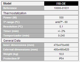 Incubator metallic with frontal door made of metacrilate, controlled by microprocessor; Digital display LCD backlighted with indication of the selected and real value of the temperature and timer. Membrane push-button control. With forced air circulation. Optional: external Tª sensor for control the temperature of the sample in its proximity. Can be adapted to our orbital shakers and horizontals (models Orbital Midi, Orbital Maxi or Horizontal Maxi).