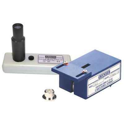The Model 263 indentation hardness tester consists of a metal block in which two pointed feet and the indenter are mounted. The indenter, made of hardened steel, is a wheel with a cutting-shaped (120°) ground edge. The total mass of the tester is 1000 ±5 g. The test load is set in the range of 4.90 N to 4.95 N (corresponding to 500 to 505 g). Thus, it meets the requirements of all standards. The measuring microscope has 20x magnification and built-in illumination. It has a measuring range of 4 mm with a pitch of 0.1 mm.