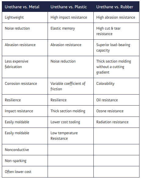 Molded polyurethanes have excellent load-bearing ability. They can support higher loads of compression than rubber or other elastomers of similar hardness – which means molded urethane components can be made smaller, for possible savings in weight and materials cost. Urethanes behave like incompressible hydraulic fluid; when under load, they don’t change volume.