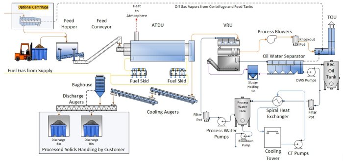 After exiting the ATDU, all process gases undergo a recovery/condensation and cooling process in the Vapor Recovery Unit (VRU). The condensables are processed in the Oil Water Separator (OWS) which is an integral part of the primary Water Treatment Unit (WTU). The recovered water and sludge from the WTU are stored in tanks or roll offs as required by the operator.