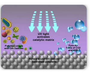 Our indoor air sanitizing system utilize two semiconductors as catalysts that use photons in the UV range of the solar spectrum as an energy source, generating free radicals that act by oxidizing microorganisms