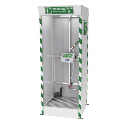 Designed for locations where space is at a premium or the emergency safety shower needs to be enclosed, this all-in-one ANSI-compliant combination cubicle shower and eye/face wash helps prevent overspray and is activated by hand upon entry. Hughes cubicle shower has a stainless steel hollow section frame enclosed in GRP sheeting with stainless steel pipes for corrosion resistance and extended life. The exterior sheeting includes universal pictogram signs and green and white safety stripes. Sump pump incorporates an integral float switch, which provides automatic pump control in the form of a low level cut out to prevent the risk of running dry—120V, 60 Hz suitable for general purpose areas.