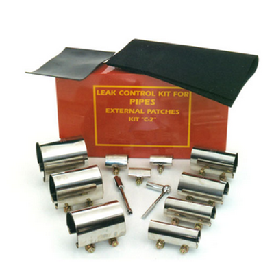 All External Pipe Leak Control Kits include extra-solid neoprene and closed-cell foam gasket material for odd-sized, out-of-round, and corroded pipe applications. Accompanying tools are available in standard or non-sparking versions. Kits are packaged in a heavy-duty carrying case.