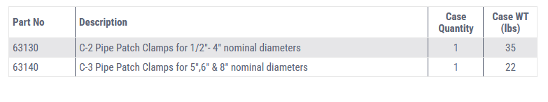 SERIES "C-3" contains three large clamps for 5", 6" and 8" diameter pipe, extra gasket material and installation tools. Clamp sizes are 5", 6" and 8".