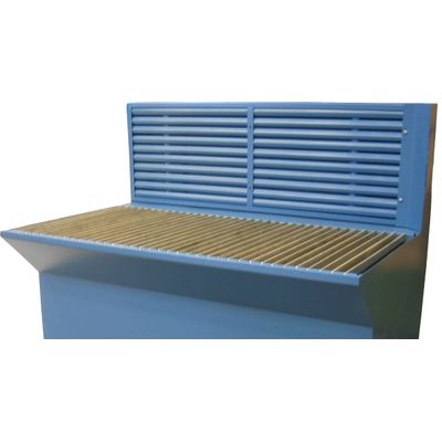 Extraction table with back wall. Application as: gluing table – grinding table – polishing table – welding table – manual cutting table. Table top and back wall delivered with steel ribs. Built-in air distribution chamber. Dust container(s) for coarse pre-separated dust. Height-adjustable.