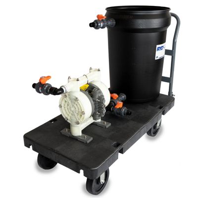 The 1” pneumatic descaling system cart is a versatile unit assembled on a 2’X4′ heavy-duty plastic cart with 8” swivel wheels. The Industrial Descaling System 10PPC contains a 30-gallon circulation bucket with a drain valve coupled via bulkhead fittings to multiple true-union valves for simplistic operation. This system is to be used with RYDLYME. View the video, here.
