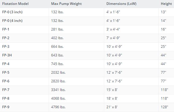 Available in 12 standard flotation packages. Designed to support any submersible pump. Capable of floating weights up to almost 4,800 lbs. Made with corrosion resistant components. Can be made customized (electric hoist, traverse winch, floating discharge, etc.).