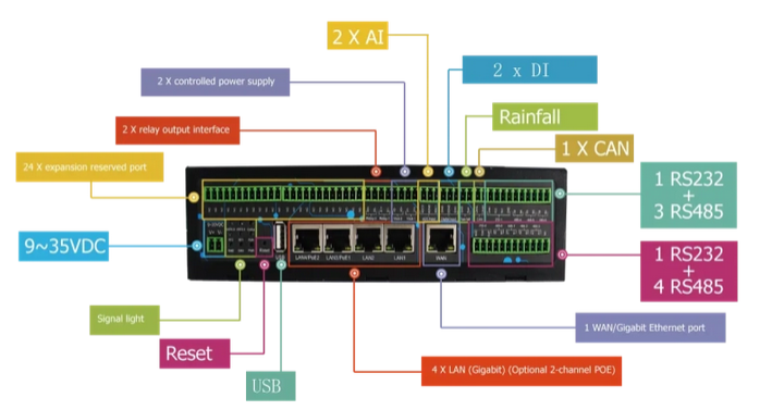 1 rainfall interface, 2 AI interfaces, 2 DI interfaces, 1 CAN interface, and 2 relay-controlled power supply interfaces.