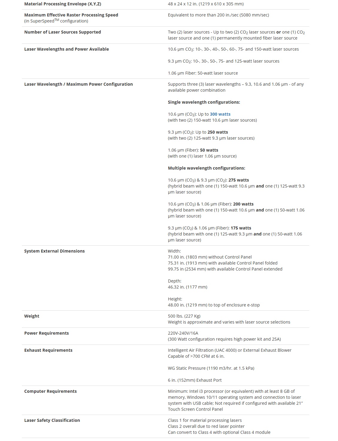 Material processing area of 48 x 24 in. (1219 mm x 610 mm). Supports material thickness up to 12 in. (305 mm). Supports three wavelengths - 9.3 µm CO2, 10.6 µm CO2 and 1.06 µm Fiber. Supports two laser sources - up to two CO2 laser sources or one CO2 laser source and one permanently mounted fiber laser source. Patented Multi-Wave Hybrid Technology. Patented Controllable Laser Power Density optics. Precision Material Independent Autofocus. Intelligent Materials Database. Multi-Camera Vision and Registration available. 21” (533 mm) Touch Screen Control Panel available. Patented SuperSpeed technology available. Fire Suppression Assistance available. UAC 4000 Air Filtration available.