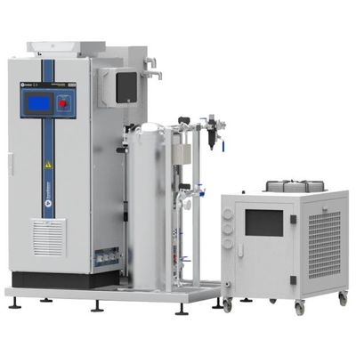Compact ozone generator, glycol-cooled and designed for high ozone concentration, features an air compressor and integrated Oxygen concentrator. It includes filters, a refrigerant dryer, a chiller, an ozone leak sensor, and a PLC control with a touch screen, data logging, and remote access capabilities. Constructed with high-quality components, this unit is ready for electrical connection and immediate operation. Robust, durable, and reliable.