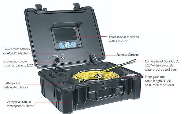 The unique design of this camera system is that all parts (including camera head, monitor, cable reel, battery pack, etc) are mounted in a robust waterproof case and cables/wires are already plugged, which enables the camera to be a real OPEN & GO pro