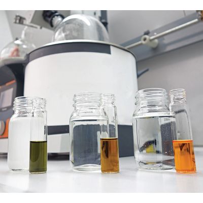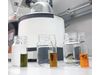 The optical COD comparison of distillate samples in the laboratory: green stands for a lot of COD, orange for little. The lighter the orange colour, the less COD is in the distillate. On the left the process water before treatment, in the middle the distillate treated with Clearcat, on the right additionally with Purecat.