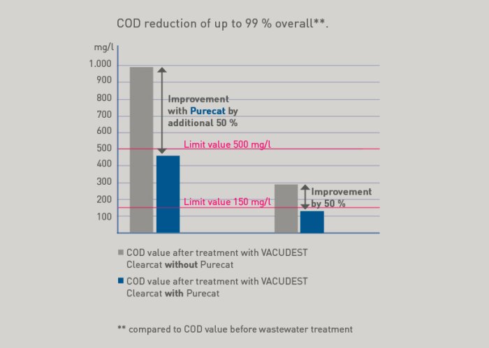 Thanks to the add-on module for our vacuum evaporators, the distillate sets new standards in many respects. Already with our patented Clearcat technology, our customers treat the wastewater in their production processes so well that the COD* value is 60 % better than with conventional vacuum distillation systems.