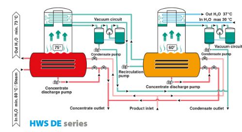 Evaporators supplied with hot water or steam, in Double Effect version with immersed plate exchangers. The HWS DE series evaporators are energy-efficient plants. As with the HWS ME series, these vacuum evaporators/concentrators require thermal energy, but only to power the first evaporative stage. The second stage, thanks to a higher vacuum value than the previous stage, allows to operate with a lower boiling temperature and it is therefore possible to exploit the thermal energy of the evaporate produced in the first evaporative stage to feed the second evaporative stage for free.