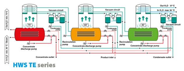 The evaporators of the HWS TE series are even more energy-efficient systems. As with the previous Double Effect version, the HWS TE series uses the thermal energy of the evaporate produced by the previous evaporation stage to feed the third evaporation stage free of charge, thus further improving the energy efficiency of the system.