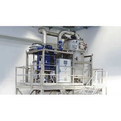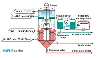 In the range of thermally powered evaporation systems, the HWS R series is designed to meet the need for very high density concentrates and for the evaporation of extremely fouling products for heat exchangers. By means of an automatic motorized scraper, which continuously keeps the heat exchange surfaces clean, higher concentrations are obtained than with other evaporative systems. The final concentrate will eventually be discharged by means of a diaphragm or progressive cavity type pump, or by placing the system above a raising frame, so that discharge through the bottom discharge valve can be made directly into a crystal separation system.