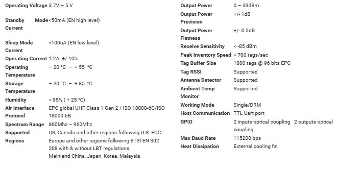 Impinj R2000 Chip. Up to 700 tags/s. DRM Supported. 4 External Antenna Ports. 860-960MHz. Tag RSSI Supported.
