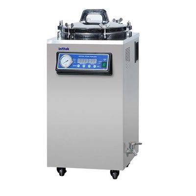 Infitek STV-I Series Class N autoclave using steam from generator to create downward displacement, which pushes air out of the chamber. The vertical autoclave chamber is from 30 liters to 150 liters, it is particularly suitable for sterilizing unpackaged solid instruments.