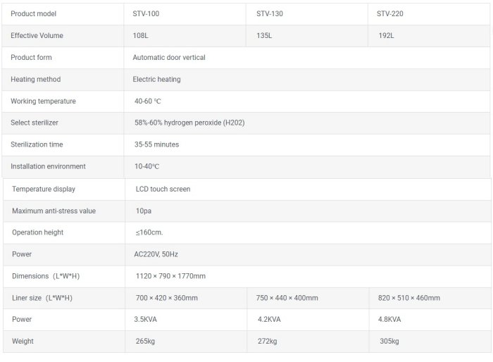 - Chamber Volume: 108L, 135L, 192L