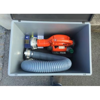 Beaver inflatable dams, standard fire hoses, and the Beaver air blower. Hardly any additional elements are needed to set up a Beaver inflatable dam.