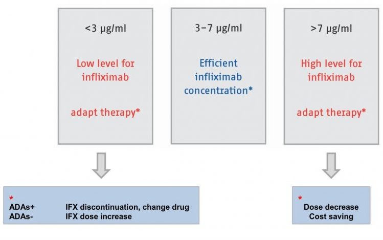 Over the past two decades great improvements in therapy of chronic inflammatory diseases have been made. The rise of TNFα biologics like infliximab has been a great step forward to ameliorating disease course and keep inflammations at remission levels for prolonged periods of time. Patients with suboptimal drug concentrations have worse outcomes than those with adequate drug levels. Therapeutic drug monitoring (TDM) for infliximab has a great potential for the management of anti TNF therapy.