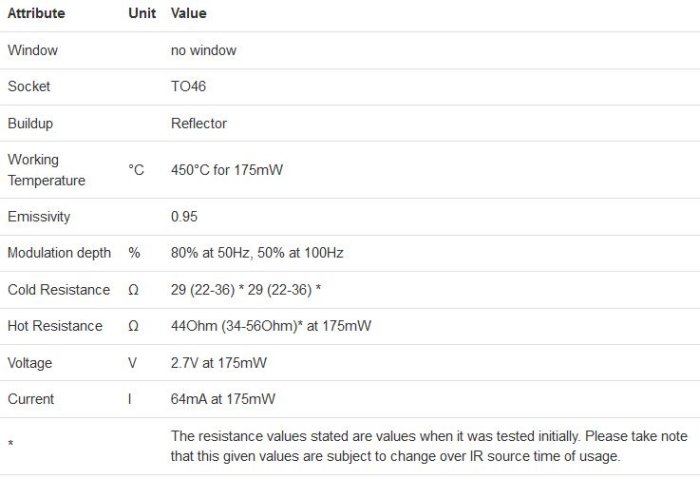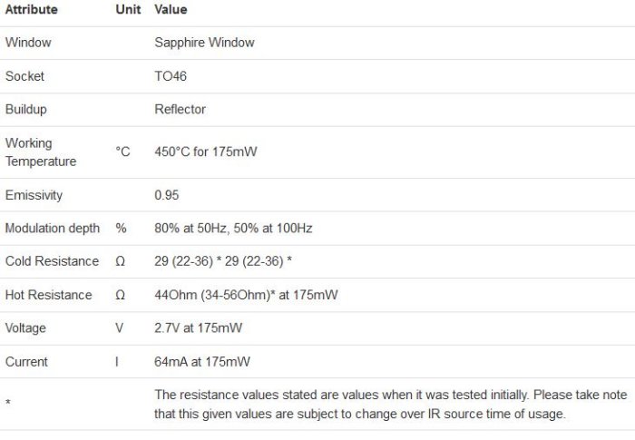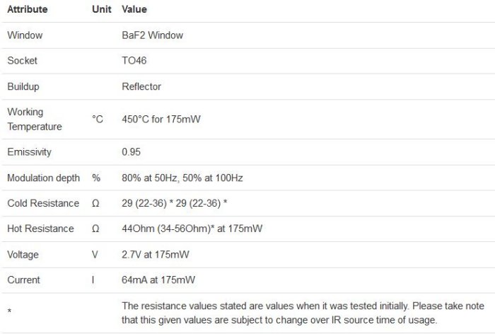 TO46 with Reflector 5; Key features for all Axetris infrared sources. True black body radiation (2 to 14 μm). High emissivity. Fast electrical modulation (no chopper wheel required). High modulation depth. Energy efficient (excellent optical output). Superior lifetime.