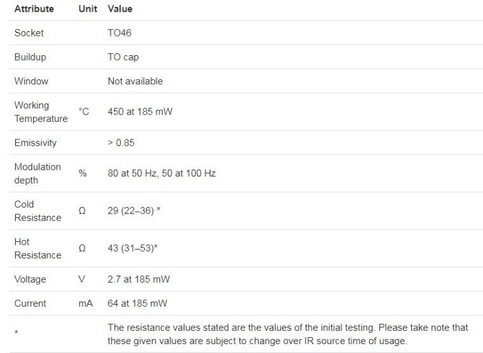TO46 with Cap; Key features for all Axetris infrared sources. True black body radiation (2 to 14 μm). High emissivity. Fast electrical modulation (no chopper wheel required). High modulation depth. Energy efficient (excellent optical output). Superior lifetime.