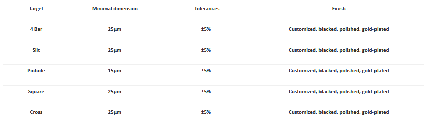 Infrared targets(IR targets) are used for testing thermal imagers operating at MWIR-LWIR spectral band. We can manufacture a wide range of IR targets by creating precision holes of different shapes, including 4-bar, circle, cross, semi-moon (semi-square), triangle etc in thin metal sheets. The surface of the metal sheet can be coated using high emissivity coating (Emissive IR targets) or polished to achieve high reflectivity (Reflective IR targets). Both types of IR targets will generate the same test results if used properly.