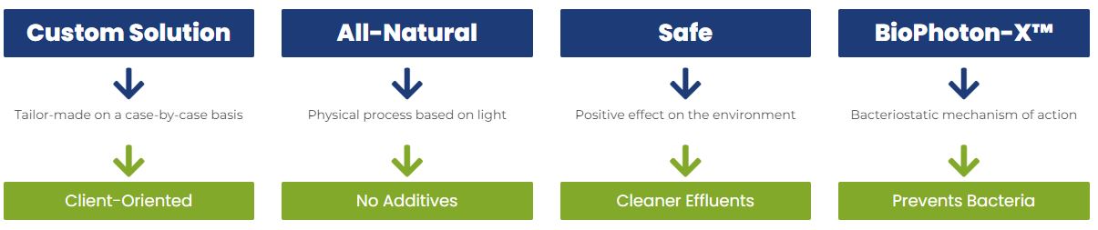BioPhoton-X™ By Engeenuity Inhibits Bacteria Reproduction in Any Setting Or Product. BioPhoton-X™ by Engeenuity is a proprietary, self-developed technology based on biophotonics, which is the modification of light to enhance biological processes. Our bacteriostatic effect inhibits bacteria reproduction and reduces overall bacterial counts. Our technology reduces, yet enhances chemical use, reducing the amount used, but increasing the effect. Applying our technology produces improved organoleptic and microbiological parameters in a variety of products and industries, being able to introduce our Mechanism of Action through water.