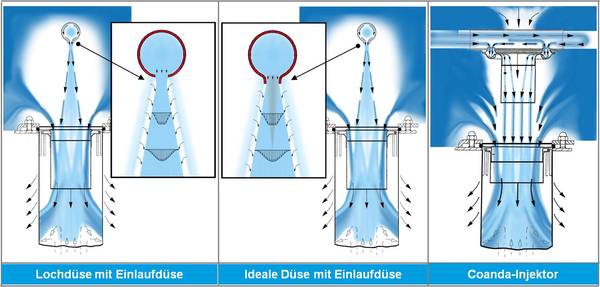 Many injector systems consist of a blowpipe simple as drilling hole type nozzle, a so-called Nozzle Injector. A significant improvement in the conversion of the static pressure energy in the blowpipe in a directed jet of compressed air is achieved by extruding the nozzle to a "ideal nozzle".
