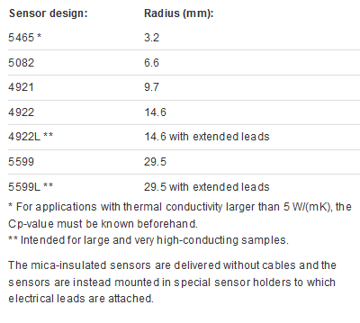 The mica-insulated sensors are designed for measurements at elevated temperatures, typically above 300 °C to a current maximum of 800 °C. Due to the strain exerted on the sensors under these circumstances, the lifetime of mica-insulated sensors is limited and they should be considered consumables. Sensors for Isotropic, Anisotropic, Slab and One-dimensional measurements, with operating temperature from 300 °C up to 800 °C: