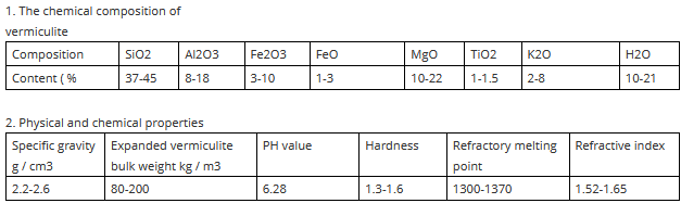The original ore vermiculite is a layered structure with a small amount of water between layers. After heating at 900-950 ℃, it can be dehydrated, bursted and expanded to 4-15 times the original volume , forming a porous light body material. It has thermal insulation, high temperature resistance, insulation, antifreeze, earthquake resistance, acid and alkali corrosion resistance, sound insulation and other properties.