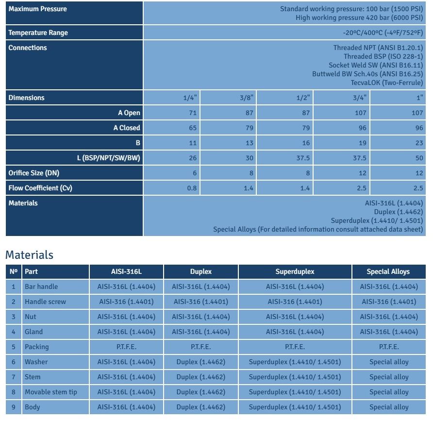 Integral Bonnet Needle Valve Working Pressures: 100 | 420 bar (1500 | 6000 PSI). TECVAL CP-15 needle valves are designed to work with all kind of fluids under high pressure or moderate vacuum service. With a compact design, the Forged Body incorporates the bonnet allowing the valves to withstand both high pressure and temperature.