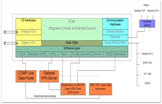 iCexM® (Integrated Cellular and Ethernet eXplorer Monitoring only). Embedded or encapsulated data producer that explores sensors, analyzers, controllers etc. over I/O, Ethernet or serial protocols, and link them to the internet by any cellular, satellite or other connection. iCex gateways solve remote data acquisition and device control (i.e. PLC, inverters, controllers) through the Internet using mobile and other networks. iCex Gateways are members of the RealiteQ platform that facilitates the monitoring of devices over public or private networks.