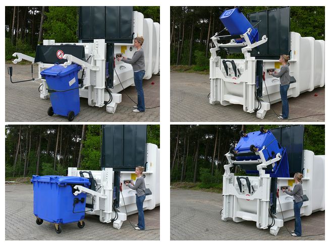 - The waste bin with up to 1,100-liter volume is pushed into the pick-up device