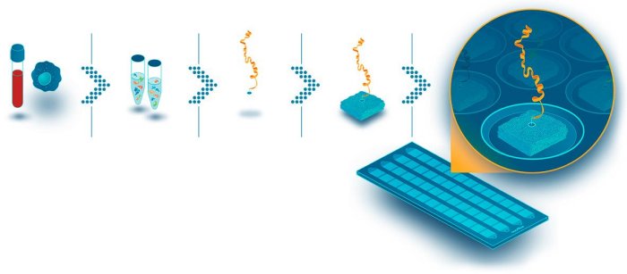 Isolated protein from blood, tissue, or cells is bound to a proprietary scaffold for single-molecule, single-protein deposition onto one of the 10 billion landing pads found on the Nautilus array. The array’s hyper-dense surface is designed with the goal of allowing identification and quantification of millions of individual protein molecules simultaneously.