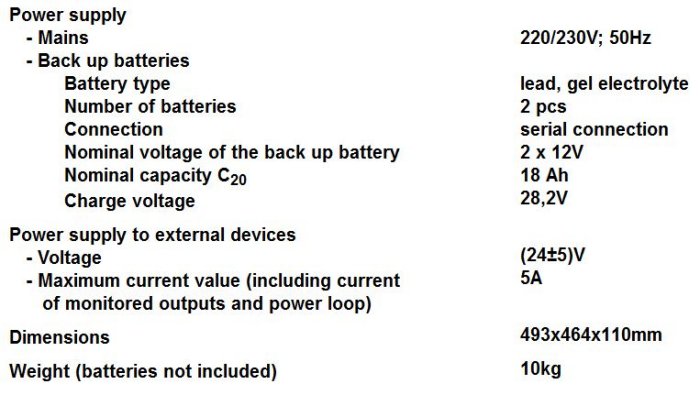 - nominal voltage of the back up battery – 2x12V DC