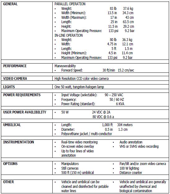 A 1000 foot (304 m) umbilical makes long penetrations possible with real-time color video monitoring, variable intensity lighting, manipulator and steering/speed control functions. Video output can be annotated with on-screen and audio information and recorded in standard VHS or SVHS format.