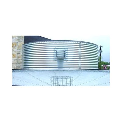 The most common CorGal tanks are available with inverted or funnel type roof systems. These tanks are often used to capture rain that falls directly onto the tank roof or to contain water that may be directed to the tank from a gutter, downspout or other water conductor pipe. A safety structure and debris filter is installed at the low point of the inverted roof CorGal tank. The safety structure will prevent a small child from falling into the tank. The debris filter will keep leaves, trash and animals from entering the water storage area of the tank. The inverted roof consists of multiple galvanized steel roof panels that are bolted together with a flat seam.