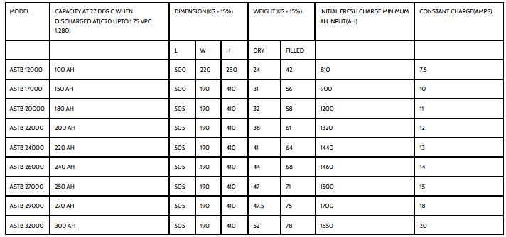 - Specific Gravity at fully Charged condition 1.240 ± 0.005 at 27 Deg C
