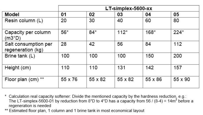 The TL-simplex softeners from Lenntech use ion exchange to soften the water. A single Fleck controller controls a resin column and a brine tank. The Fleck 5600 can handle flow up to 2 m3/hr. The mixing valve makes it possible to adjust the remaining hardness.