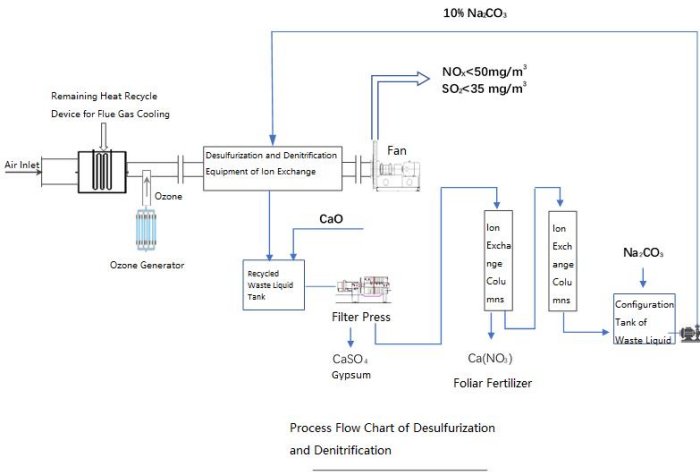 A strong alkali ion exchange fiber is used as the core material for denitrification. After the flue gas is mixed with ozone, the NO in the flue gas is quickly oxidized to NO2 and N2O5. Both are dissolved in water and generate nitrous acid and nitric acid. Nitrates are adsorbed by the ion exchange material at the same time to achieve low NOx emission. When the ion exchange material reaches saturation, it is regenerated with 10% Na2CO3. It continues to be used after regeneration.