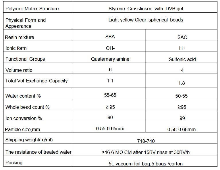 MB101 is premium grade of resin mixture consist of high performance and purity of SAC resin in H+form and SBA resin OH in form,selected uniform particle size. MB101 is suitable for use in regenerable and non-regenerable mixed bed unit.Passage of water at suggested flow rate through the resin can achieve complete reduction of TDS.The residuals produce average resistance values of around 16.6MΩ.CM,effectively