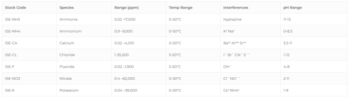 There are two basic sensor constructions: PVC on a solid-state substrate and Crystal membrane with a solid-state contact. Crystalline electrodes maybe polished and cleaned as the electrode gets older. The PVC equivalents are less prone to oxidation and can be rinsed after use but cannot be polished. The lack of internal solution means that lifetime is enhanced and submersion is possible as the sensor does not flex under reasonable pressure. Each SMART STORM’S Combination ISE has a 1 metre cable and can be used both on Smart Storm’s USI and USM products and all other types of pH/ION meter including laboratory bench and research models. The solid-state sensors have a huge advantage over conventional ISEs in that there is no internal fill solution to degenerate the sensor this means that SMART STORM’S direction combination ISEs have an unrivalled lifetime and a very low cost of ownership. For optimum results use SMART STORM’S Ionic Strength Calibration Buffers ( ISCBs).