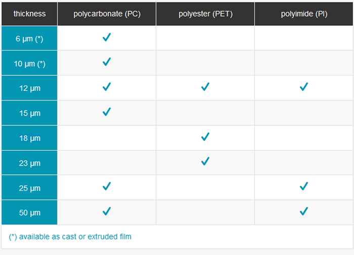 We apply track-etching technology to fully transparent POLYCARBONATE (PC) and POLYESTER (PET) raw films, as well as to brownish yellow POLYIMIDE (PI) film, available in various thicknesses ranging from 6 to 50 microns.