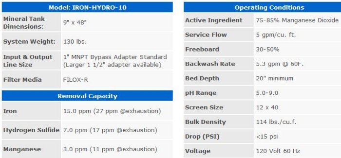 Designed for 1-2 Bathrooms Homes, 5 Gallons/Minute. . Guaranteed Iron, Hydrogen Sulfide and Manganese Removal. . Reduced Red Staining, Rust Particles & Rotten Egg Odor. . No Oxidizing Chemicals Needed for Regeneration, Water Only. . Effectively Treats Broad pH Range, 5.0 to 9.0 pH. . No Need to Add pH Amendment to the Iron Removal. . Superior Media Strength, Efficient, Economical and Durable. . High Service Flow Rate and Long Service Life. . User Friendly, Low Maintenance Electronic Time Clock Valve. . Offer Expires.