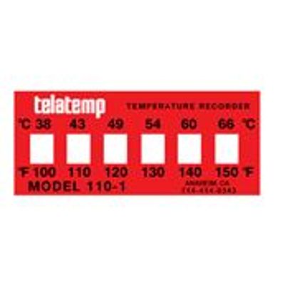 The Telatemp Model 110 series non-reversible temperature recording labels contain six temperature sensitive increments that turn irreversibly black at the rated temperature. High temperature models are white in color with gold windows. Other model variations are available with specialized ranges including a 4 window and 10 window model.